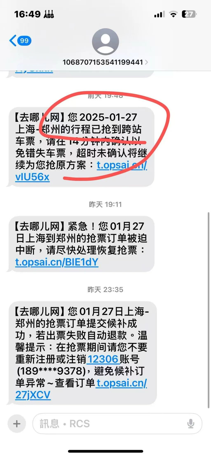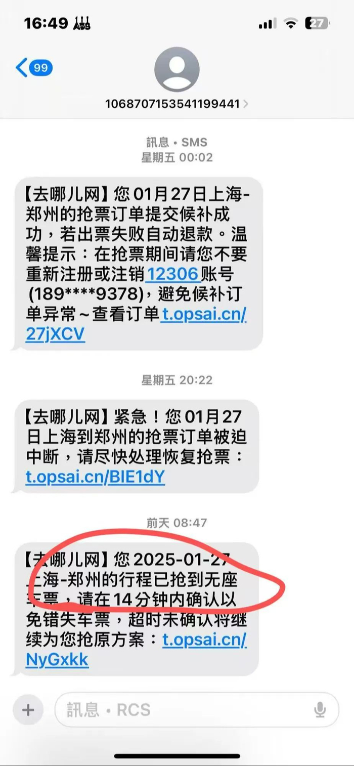 1月25日8时47分,平台发消息称已经抢到了无座车票,记者因故未能点确认,当天19时48分又发来消息提示抢到跨站车票,仍因故未能确认。最后,去哪儿网在1月26日抢票截止时间到了后全额退款208.5元。