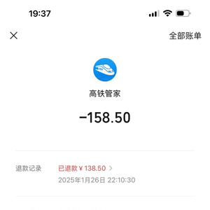 抢票未果后,高铁管家也进行了退款,澎湃新闻记者注意到,高铁管家只退款138.5元,但买票时一共付了158.5元,被扣除20元。