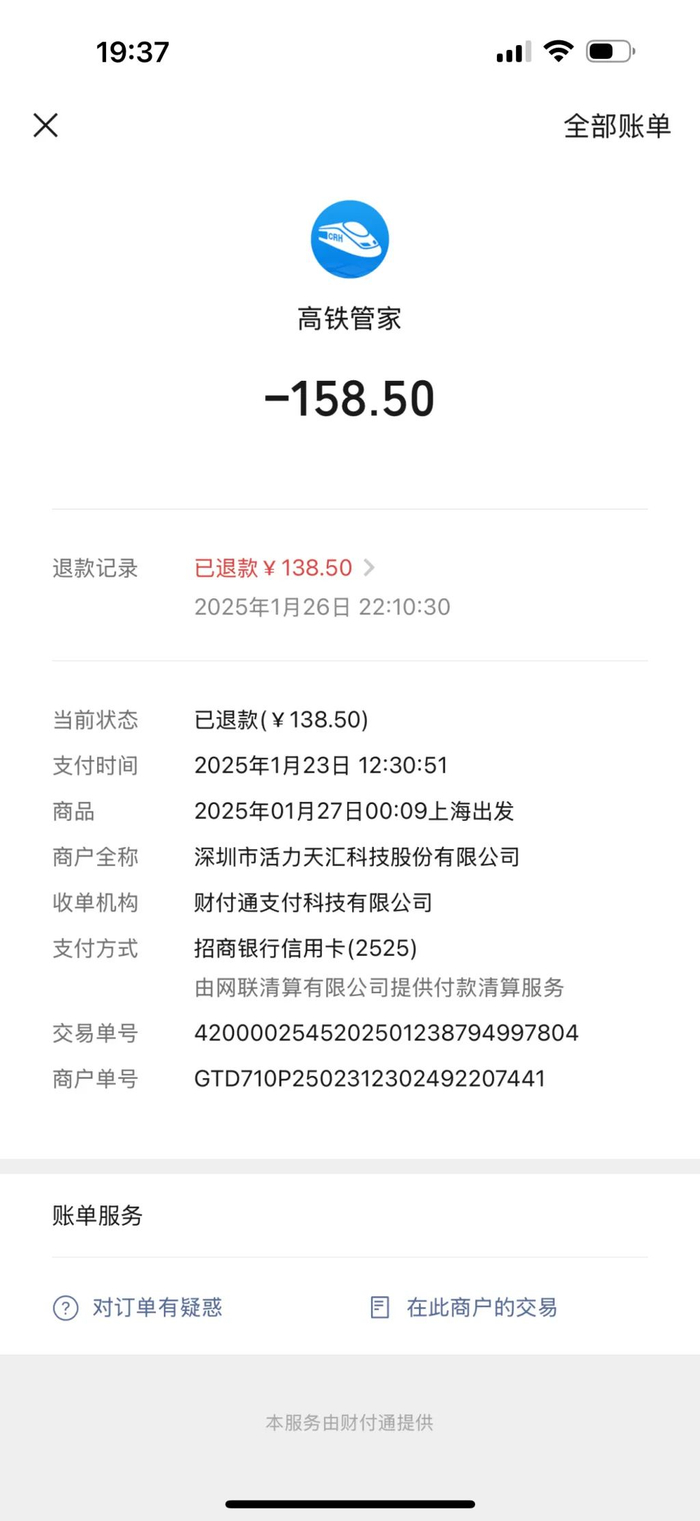 航旅纵横:36元的专人抢票未能抢到票