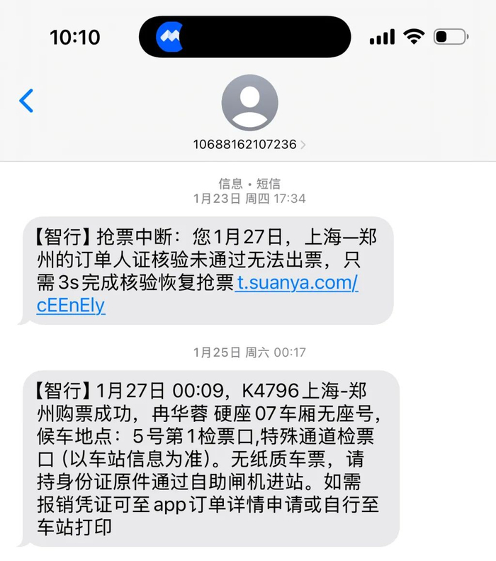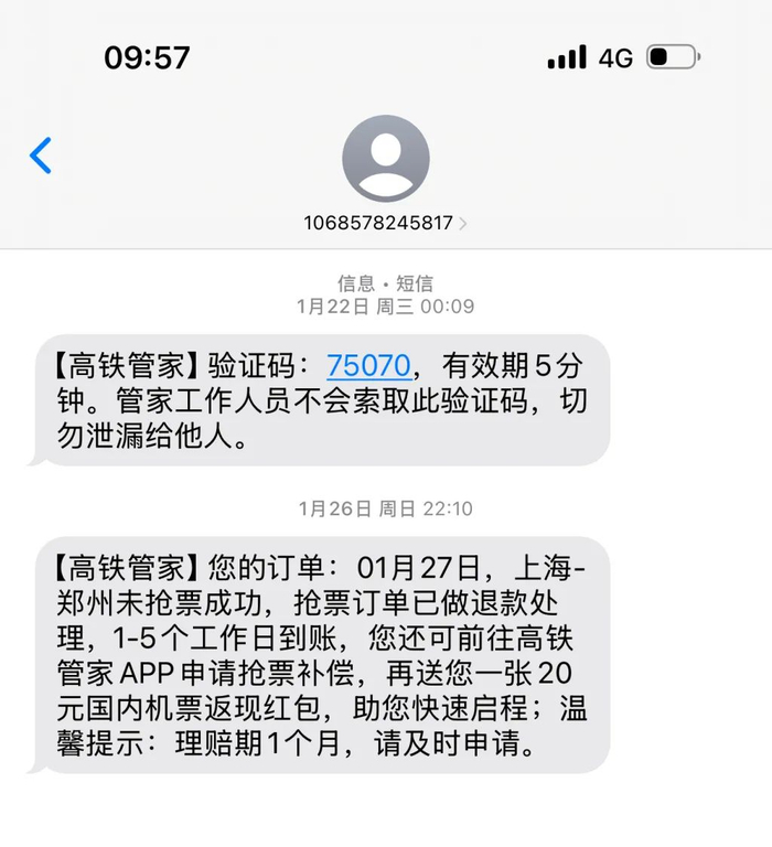1月25日0时17分,智行App短信通知购票成功。