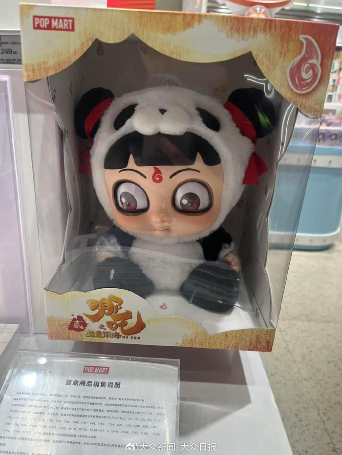 泡泡玛特店员告诉汪先生,这几天,来店里“找藕饼”(注:哪吒和敖丙的组合,被网友称为藕饼组合)的顾客太多了。最抢手的联名手办盲盒已经全部断货,店内目前还剩下几个哪吒搪胶脸毛绒玩偶,价格为249元。