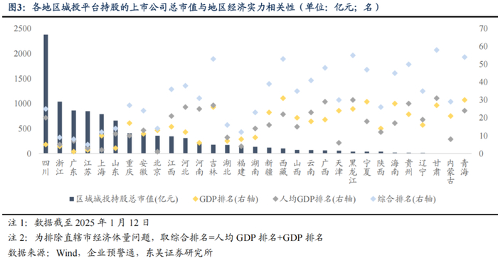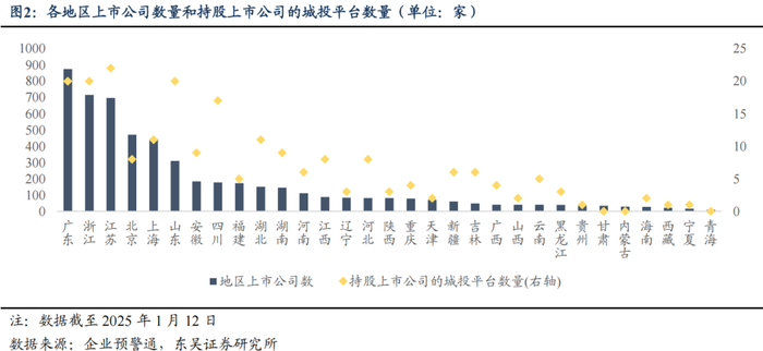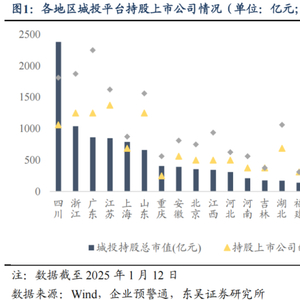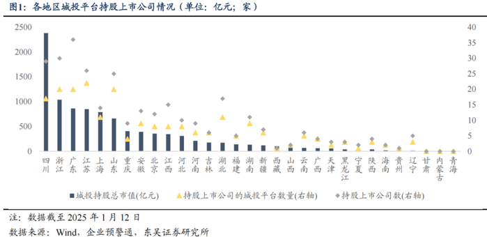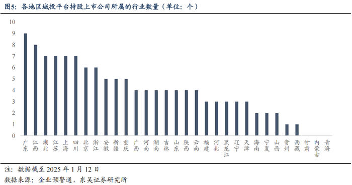 从各地区城投平台入股上市公司的市值情况来看,截至 2025 年 1 月 12 日,四川省城投平台持股市值位居前列,达到 2380.71 亿元,其次为浙江 1039.05 亿元、广东 861.32 亿元、江苏 848.97 亿元、上海 789.88 亿元、山东 659.69 亿元,其余省市持股市值均在 500 亿元以下。从持股上市公司及其子公司的城投平台数量来看,江苏、山东、浙江、 广东、四川地区持股上市公司的城投平台数量分别为 22、20、20、20、17 家;广东、浙 江、四川、江苏、山东地区的城投平台持股的上市公司数量分别为 36、30、29、26、25 家,各地持股上市公司的城投平台数量、持股的上市公司数量基本和持股市值同向变化;结合各地区上市公司资源来看,拥有上市公司数量较多的区域分别为广东、浙江、江苏、 北京、上海、山东,各拥有上市公司 815、716、697、471、445、310 家,整体来看区域内上市公司数量与区域内持股上市公司的城投平台数量之间具有一定的正相关关系,可见区域本身的上市公司资源是否充沛较大程度上决定当地城投平台持股上市公司的可行性与积极性,进而对城投平台借助所持股上市公司的利润分配和业务布局来优化造血能力、尝试产业化转型提供一定支撑。
