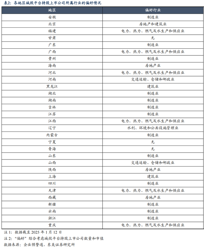 1)制造业上市公司数量占城投持股上市公司中的“半壁江山”,主要或源于 a)制 造业尤其是重工业、基础工业、装备制造等业务板块对基础设施建设的依赖性较强,与多数城投平台的主营业务关联度较高,故吸引地方城投平台的投资;b)制造业企业通常拥有稳定的现金流和较高的市场份额,或可为入股的城投平台带来稳定的股息回报;c)我国作为制造业强国,各地制造业蓬勃发展并已成为支柱产业,地方政府对于制造业产业链的支持力度较高,故城投平台注资符合地方政策导向,同时未来城投平台向制造业转型的难度或可降低。