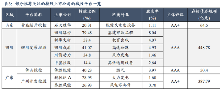 持股上市公司的城投平台凭借拥有上市公司业务资源和分红收益而具备相对可观的转型成功可能性,其中持股结构稳定、所属地方实力雄厚且转型意愿强烈、所持股上市公司所在行业护城河宽广的城投平台具有更高的关注价值,如浙江、广东、江苏、四 川、重庆等区域的平台公司,其利润来源的相对稳定、经营风险的相对分散有助于降低该城投平台的偿债压力和违约风险、降低该平台存续债券估值受板块舆情的影响。此外, 由于化债工作的持续推进,城投板块融资端趋紧的方向预计维持,平台公司“发展资本” 来源将明显受限,而通过持有上市公司股份来实现业务多元化、业务“破圈”化的可行性及有效性或有所抬升。