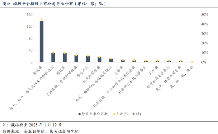 截至 2025 年 1 月 12 日,以国标行业分类为基础,全国范围内城投平台持股的上市公司行业类型以制造业为主,共 139 家,占比 45.28%,其次分别为电力、热力、燃气及 水生产和供应业 31 家,占比 10.1%,建筑业 30 家占比 9.77%,交通运输、仓储和邮政业 23 家占比 7.49%,房地产业 21 家占比 6.84%,整体行业分布呈现较高集中度。具体而言: