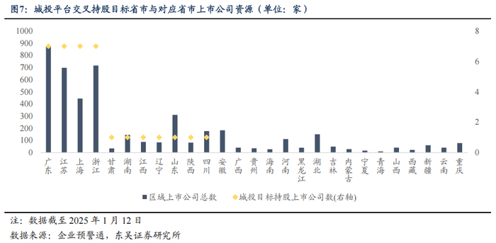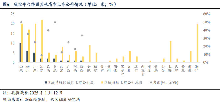1)截至 2025 年 1 月中旬,持股区域外上市公司数量较多的区域包括山东、四川、广东等,持股区域外上市 公司数量占本地城投平台持股上市公司总数比例较高的区域包括山东、 重庆、云南、四川、陕西等,城投平台持股的目标区域主要集中于广东、 江苏、上海、浙江等。