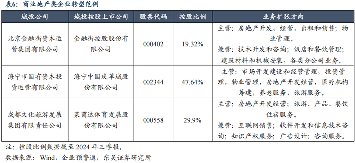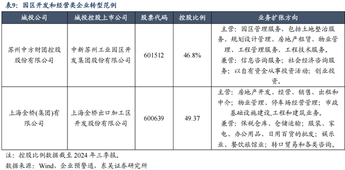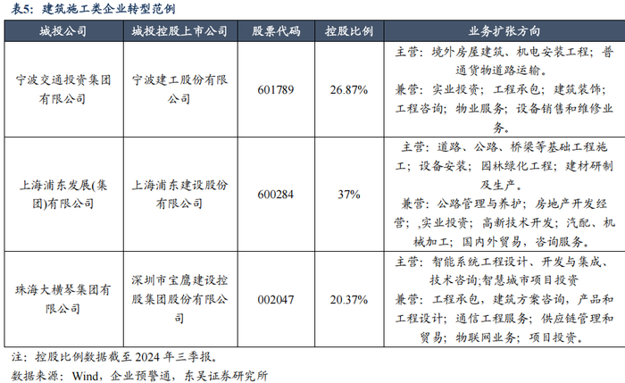 我们在 2024 年 10 月 16 日发布的报告《城投主体“退平台”进程如何?》中曾阐 述了城投平台的主要转型路径,分别为经营类企业、产业控股和投资类企业以及园区开发和经营类企业,三条路径均已有部分城投平台成功通过持股或控股上市公司并以此为媒介逐步进入或实现转型。过程中,城投平台通过帮助原有子公司上市(本体上市)、间接控制本地上市公司或注资控制外地上市公司来实现业务置换和企业存续,帮助降低转型失败的风险。