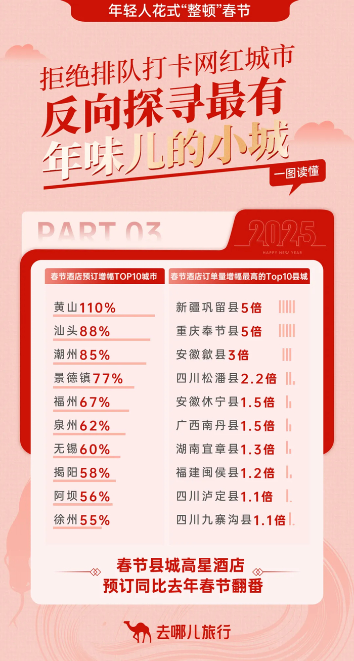 据去哪儿平台统计,从春节酒店预订量增幅来看,热度蹿升最快的都是“年味儿”爆棚的小城,汕头酒店预订量同比增长八成。