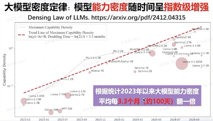 过去几年,我们可以看到类似摩尔定律的现象,大模型的能力密度正随时间呈指数级增强。2023年以来,大模型的能力密度大约每100天翻一倍。也就是说,每过100天,我们只需要一半的算力和一半的参数就能实现相同的能力。