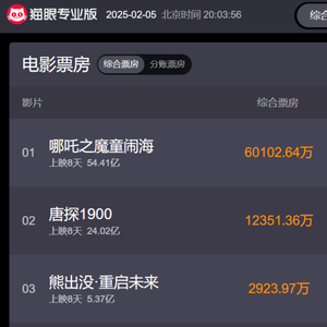 54.41亿元,这是国产动画电影《哪吒之魔童闹海》的票房数字(截至2月5日晚8点)。猫眼App给出的预测,更是达到惊人的87.38亿。