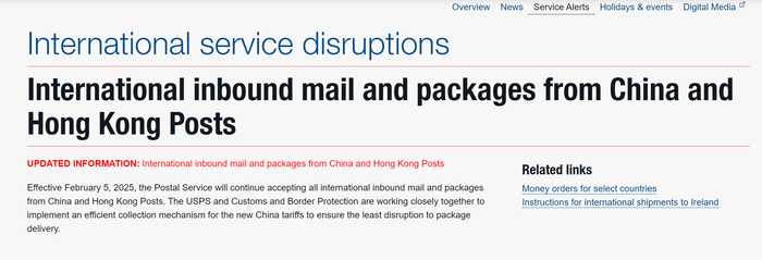 此前,美国邮政服务(USPS)当地时间周二(2月4日)晚间宣布,从2月4日起暂停接收从中国内地和中国香港寄出的包裹,直至另行通知。