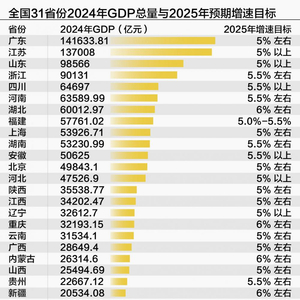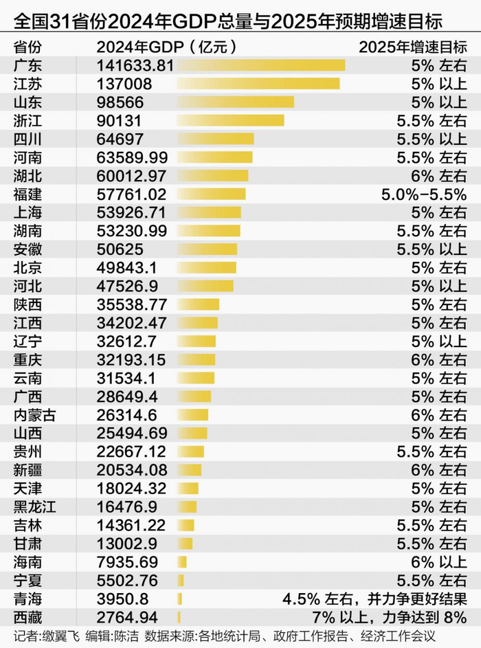 目前,各省份的2025年增长目标也已全部公布:西藏为增长7%以上、力争达到8%;海南为6%以上;内蒙古、湖北、重庆、新疆为6%左右;安徽、四川为5.5%以上,吉林、浙江、湖南、河南、贵州、甘肃、宁夏为5.5%左右;福建为5.0%至5.5%;河北、辽宁、江苏、山东为5%以上;天津、北京、黑龙江、上海、广东、广西、江西、云南、山西、陕西为5%左右;青海为4.5%左右。