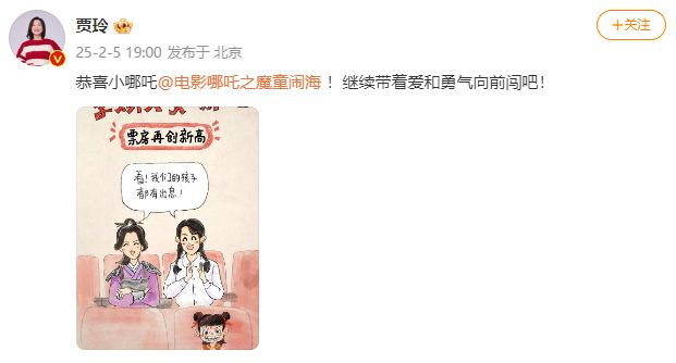 电影《你好李焕英》的导演贾玲也转发贺图:“恭喜小哪吒!继续带着爱和勇气向前闯吧!”