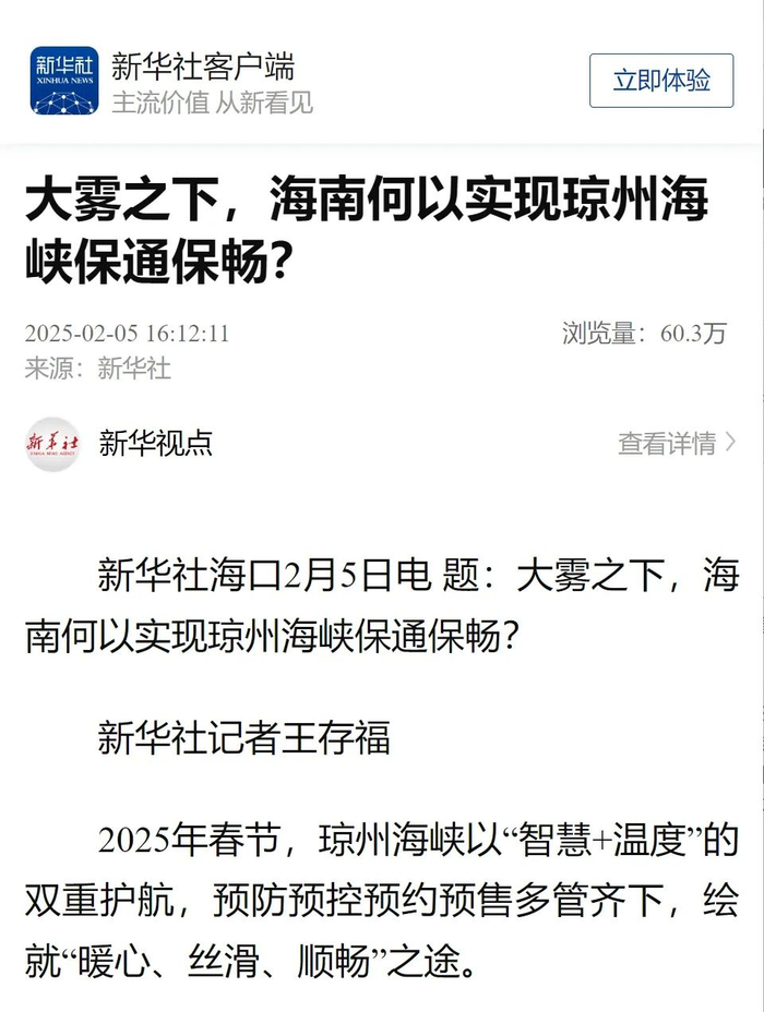 2月5日,新华视点发布文章《大雾之下,海南何以实现琼州海峡保通保畅?》,关注2025年春节,琼州海峡多措并举,保障旅客暖心、丝滑、顺畅过海。