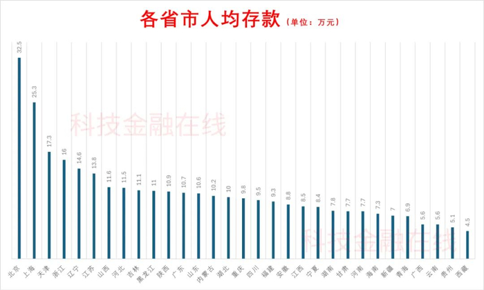 从各省市人均存款数据看,排名前三分别为北京、上海和天津,北京人均存款32.5万元,上海人均存款25.3万元,天津人均存款17.3万元。紧随其后的是浙江、辽宁、江苏,分别为16万元、14.6万元、13.8万元。