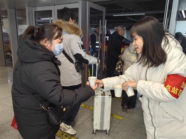 丰台站南枢纽的旅客休息区内,“旅客身边人”正在为旅客分发暖心姜汤。