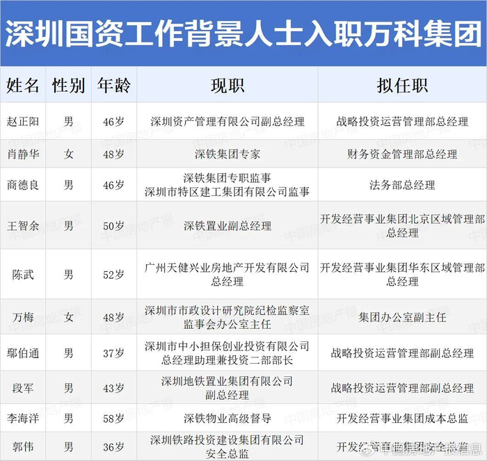 2月5日稍早时间,万科亦在内部发文,宣布多位高管人事任命,涉及战略投资运营管理部、财务资金管理部、法务部等集团总部,以及北京、华东等开发经营本部等多个核心岗位。这些新任命人员,全部来自深圳国资系统。