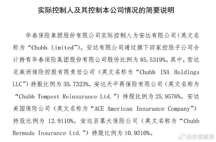 据华泰保险集团股份有限公司官网显示,华泰保险集团股份有限公司实际控制人为安达有限公司(英文名 称为“Chubb Limited”)。安达有限公司通过旗下四家控股子公司合计持有华泰保险集团股份有限公司股份比例为 85.5319%。