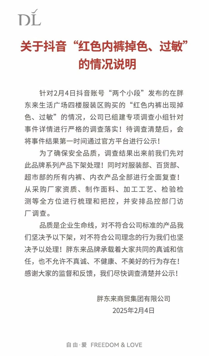 值得注意的是,针对2月4日抖音账号“两个小段”发布的在胖东来生活广场四楼服装区购买的“红色内裤出现掉色、过敏”的情况,胖东来此前回应称,公司已组建专项调查小组针对事件详情进行严格的调查落实。待调查清楚后,会将事件结果第一时间通过官方平台进行公示。