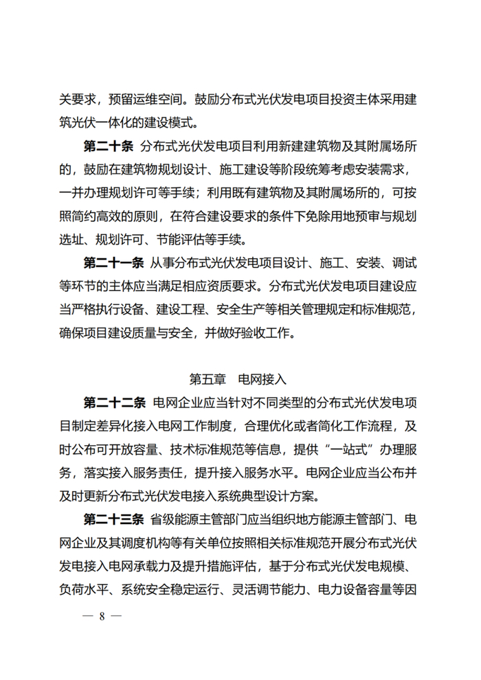 《管理办法》包括总则、行业管理、备案管理、建设管理、电网接入、运行管理以及附则七个章节,共四十三条,覆盖了分布式光伏发电的定义分类和项目全生命周期各阶段的管理要求,涵盖了行业主管部门、投资主体、电网企业等各方的职责要求,形成一套横向到边、纵向到底的支持性、规范性管理体系。