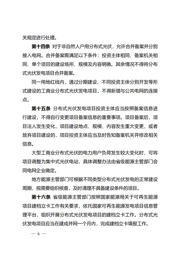 在备案方面,非自然人投资开发建设的分布式光伏发电项目不得以自然人名义备案,本办法印发前已由自然人备案的,可不作备案主体变更,仍按原备案项目类型管理,但投资主体应当主动向备案机关和电网企业告知相关信息,明确承担项目运行维护的主体及相应法律责任。