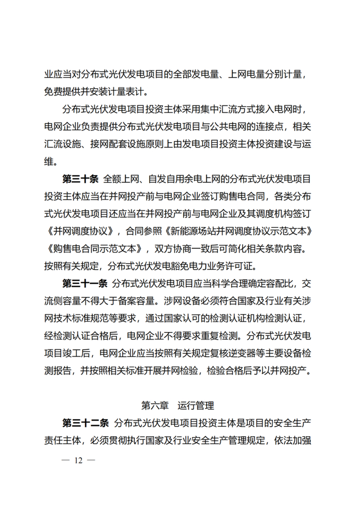 (六)运行怎么规范。《管理办法》明确了分布式光伏发电项目的安全生产、调度运行、模式创新、运维管理、信息管理、消纳监测、改造升级等方面的要求,形成闭环管理。模式创新方面,允许项目通过微电网、源网荷储一体化、虚拟电厂聚合等形式参与调度,大型工商业分布式光伏发电项目可与用户开展专线供电。由于分布式光伏发电点多面广、量大分散,且不同地区的发展条件与基础差异较大,《管理办法》提出各省级能源主管部门可根据本办法,会同国家能源局派出机构制定适应本省(自治区、直辖市)实际的实施细则。