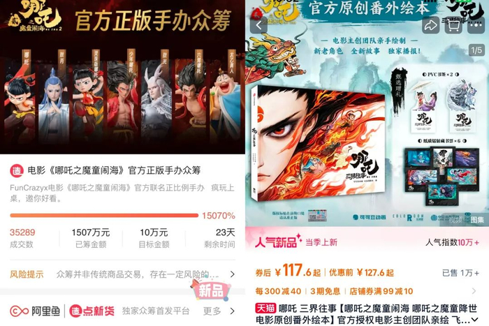 FunCrazy与《哪吒之魔童闹海》官方联名正比例手办于1月29日开启“众筹项目”, 截至2月6日上午,实时众筹金额已突破1500万元。其中,敖光手办单款销量突破万件,包含敖光在内的368元、560元、1938元档第一批众筹火速售罄。抖音桑尼森迪旗舰店的《哪吒之魔童闹海》盲盒,销量已超32万,讲解该产品的直播间也有上万人同时在线围观。