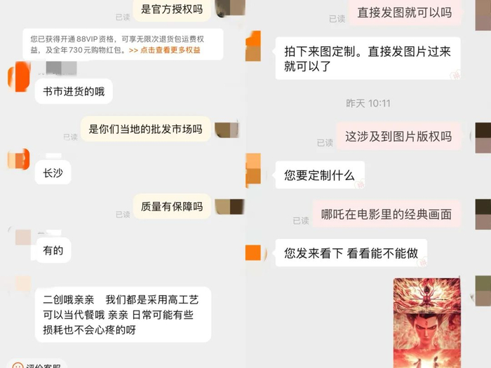在这些盗版周边产品中,有的直接将“哪吒”“敖丙”的经典表情、片中台词印到相关产品上,有的则对人物形象进行了再次创作。当被问及是否有官方授权时,这些非官方授权的卖家均未正面回复,而是表示产品从批发市场进货、自制。