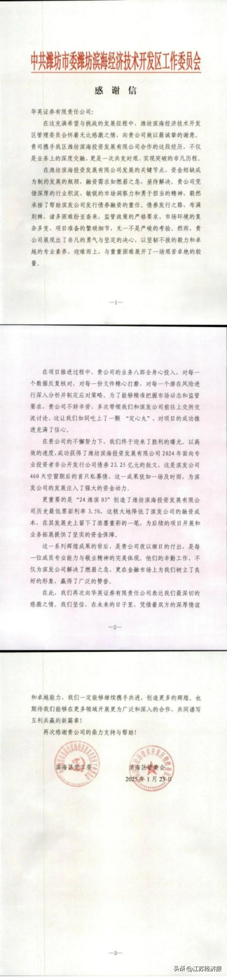 潍坊滨海经济技术开发区管理委员会发来感谢信,对华英证券业务八部帮助滨发公司发行债券融资表示感谢,并期待今后能继续携手共进,在更多领域开展更为广泛和深入的合作,共同谱写互利共赢的新篇章。