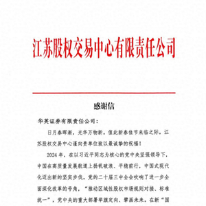 江苏股权交易中心有限责任公司发来感谢信,对华英证券关注和支持江苏股权交易中心有限责任公司工作,助推区域性股权市场高质量发展表示感谢。