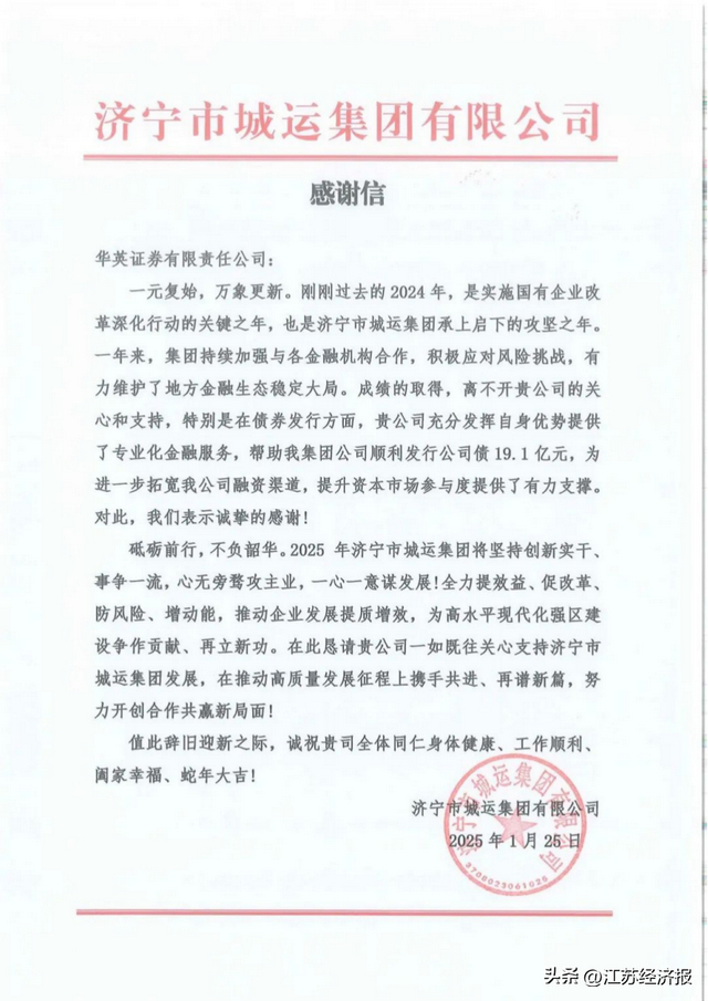 济宁市城运集团有限公司发来感谢信,对华英证券提供专业化金融服务,助力济宁集团进一步拓宽融资渠道表示感谢。