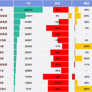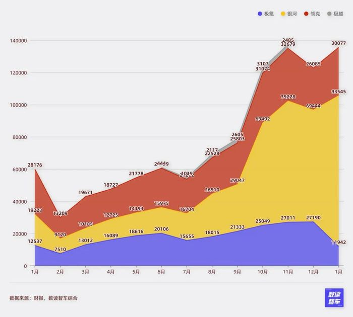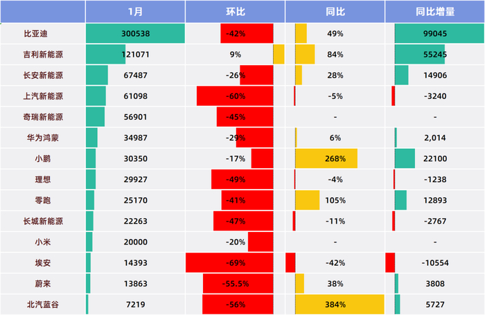 1月,在14家车企中,吉利是唯一在新能源汽车上呈现环比增长的。