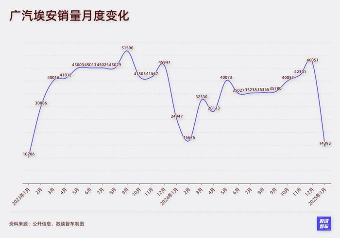 埃安是去年相对失意的品牌。当初,埃安曾经力压蔚小理,在2023年,埃安一度单月销量突破5万台,是为数不多能取得这样销量突破的品牌。