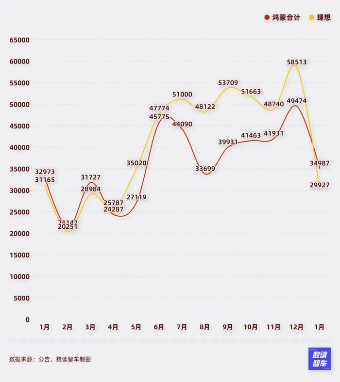 不过,这样的格局也会在2025年发生变化,至少销量数据的领先地位难以维持。1月,新势力销量大洗牌,鸿蒙智行凭借34987台重新回到第一。理想销量为29927台,没能守住3万台大关,甚至是同比环比双下滑,被小鹏赶超。