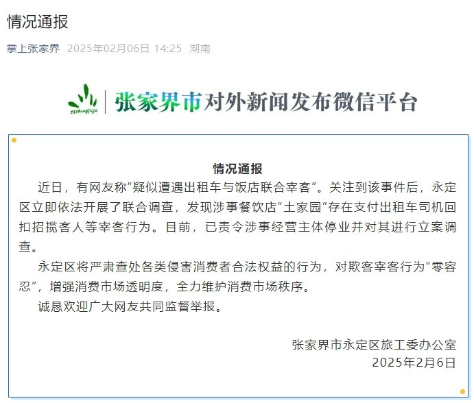 网友称“疑似遭遇出租车与饭店联合宰客” 张家界永定区通报
