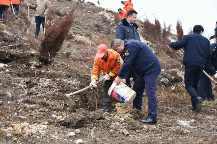 植树现场,参加植树的党员干部拿起铁锨,分工协作,配合默契,挥锹铲土、扶苗填坑、培实新土、提桶浇水,干劲十足。经过一个多小时的忙碌,新栽的树苗整齐排列,为初春的大地增添盎然生机。