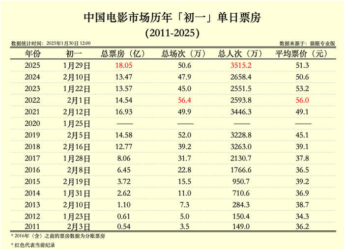 预售票房突破10亿元的大年初一,最终也以18.05亿元成为中国电影历史上票房最高的一天,同比涨幅高达34.22%。据猫眼专业版,1月29日14时,当日票房就已超越2024年正月初一总票房;在19时,当日票房已超过2021年正月初一的16.93亿元,并打破了单日票房纪录。