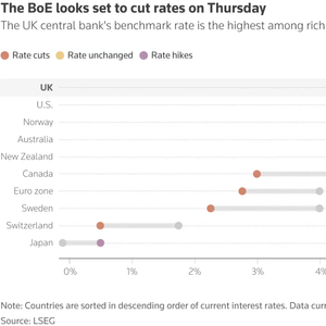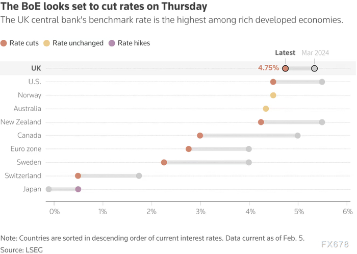 英国央行指标利率目前为4.75%,是大型发达经济体中最高的。外界普遍预期该央行周四将降息25个基点,达到与挪威相同的水平,并接近美联储4.25-4.5% 的利率区间。