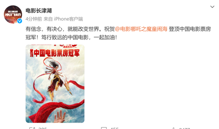 今日,电影《长津湖》发出祝福海报,祝贺哪吒登顶,“笃行致远的中国电影,一起加油”!