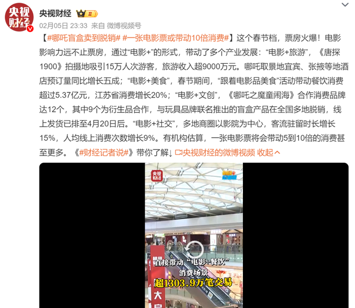 据@央视财经 报道,《哪吒之魔童闹海》合作消费品牌达12个,其中9个为衍生品合作,与玩具品牌联名推出的盲盒产品在全国多地脱销,线上发货已排至4月20日后。
