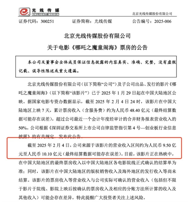 据光线传媒公告,截至2025年2月4日,《哪吒2》累计票房收入(含服务费)约为人民币48.40 亿元,公司来源于该影片的营业收入区间约为人民币9.5亿元至人民币10.1亿元。