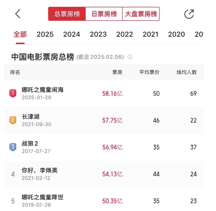 值得注意的是,《哪吒2》登顶仅用了8天5小时,而《长津湖》达成这一纪录用时近两个月。