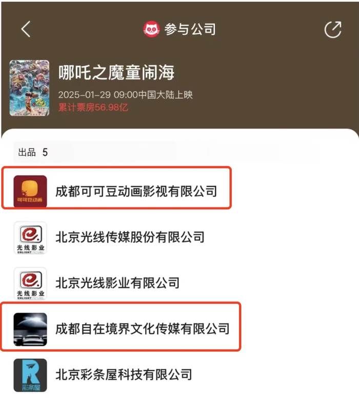 公开资料显示,《哪吒2》共有5家出品方,分别为成都可可豆动画影视有限公司、北京光线传媒股份有限公司、北京光线影业有限公司、成都自在境界文化传媒有限公司,北京彩条屋科技有限公司。