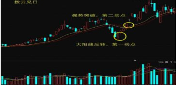 2、高开收阳,则冲高后再次回落到舍线位置时为最佳低吸点,随之而来的是调整结束后的冲线上升行情。