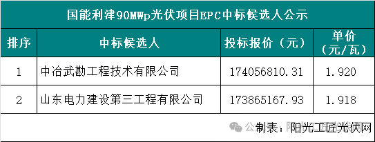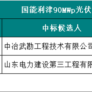 2月6日,山东公司绿能利津公司国家能源利津600MW光伏项目(三场区72MW项目)EPC工程公开招标中标候选人公示,该项目规划交流测总装机容量72MW(直流侧装机容量90.6528MWp),中冶武勘工程技术有限公司以1.92元/瓦位列第一候选人。