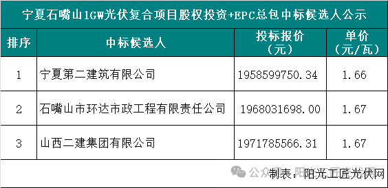 1.66元/瓦丨宁夏石嘴山1GW光伏项目EPC总包+股权投资中标候选人公示