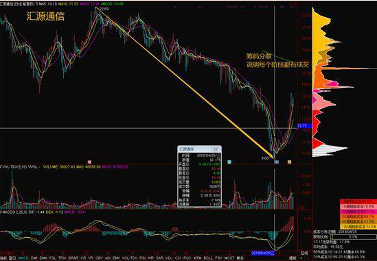 一般来讲,筹码分散状态出现在上涨或下跌的过程中,或者是横盘吸筹的初级阶段,这个时候市场的成交相对分散,筹码分散。比如在下跌的过程中,显示出筹码分散的状态,说明在每个价格段,都有大量的成交,如果抛开主力对倒的情况,那说明有不少资金在下跌过程中抄底,而且出现亏损,那么这个时候,无论是下跌还是上涨,都会面临很大的抛压,对于股价的运行都是不利的。所以,当筹码出现分散状态时,我们一定要多观察,如果是中长线操作,尽量先观望,如果是短线操作,还需要从其他的方面来考察