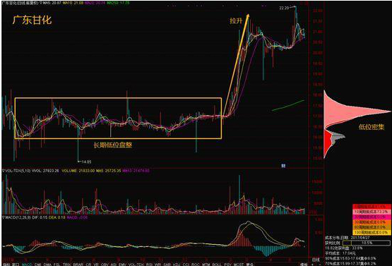 底位密集形态一般出现在底部横盘的阶段,说明主力在底部充分收集筹码,市场成本集中在相对低的价格。如果股价向上运行,只有获利盘的抛压,而几乎没有解套盘的抛压。假如该股真的有主力在底部收集筹码,那么此时拉升股价,获利盘中大部分都是主力的筹码,抛压也不会很大。而且,能够接受长时间底部盘整而不卖出的投资者,一般也是比较有耐心的投资者,大部分不会满足于十几二十几个点的涨幅,所以这些筹码也相对稳定。如果主力在拉升之前再来一些试盘和洗盘的动作,那很大概率回来一波不错的上涨