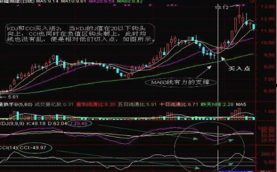 案例2:此时J值并不在负值区,而是在20附近拐头向上,同时CCI也在负值去钩头朝上,此时均线也没有乱,股价在60日均线成功企稳,买入点显现。可以着手切入。