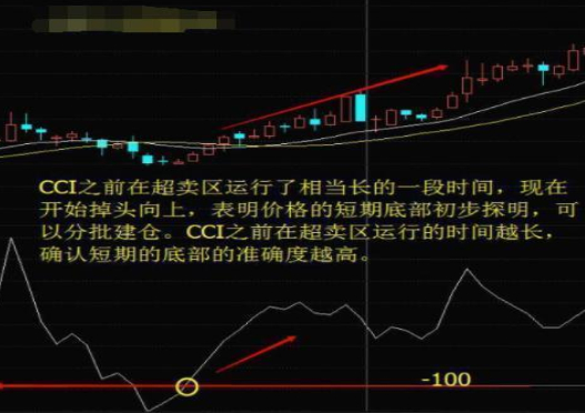 3.如果CCI指标本来在-100的超卖区运行,现在突破了-100线,开始上行,说明超卖区状态基本结束,K线开始反弹了,股价将上涨。